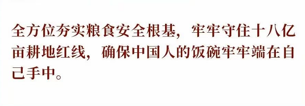 在时间上,年年要抓紧。要牢牢把住粮食安全主动权,粮食生产年年要抓紧。在数量上,18亿亩耕地红线。要严防死守18亿亩耕地红线,采取“长牙齿”的硬措施,落实最严格的耕地保护制度。在质量上,高标准农田:要建设高标准农田,真正实现旱涝保收、高产稳产。在保护上,黑土地保护:要把黑土地保护作为一件大事来抓,把黑土地用好养好。