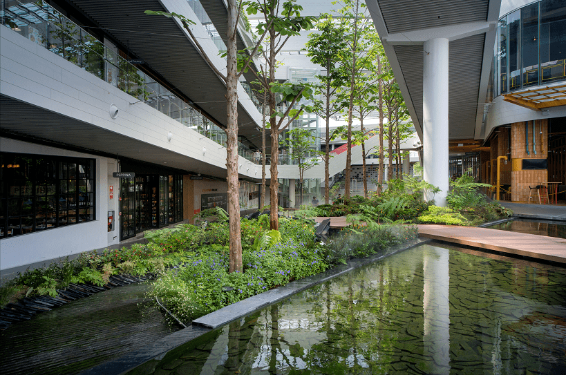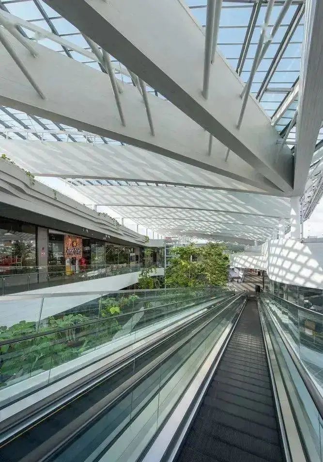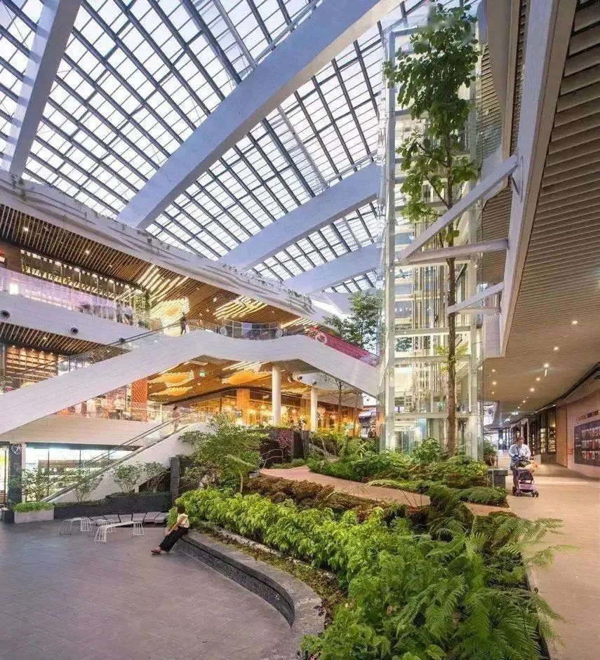 近几年,国内也出现了许多把绿色生态搬进商场的优秀代表,如香港置地打造的重庆光环购物公园。项目创造了一个由近300种热带雨林植物构成、垂直穿越整个商场的“沐光森林”植物园。商场顶部还设有7棵“悬浮树”和20米高的瀑布,非常壮观。走进植物园里,仿佛一脚踏进了亚马逊森林,能深刻感受到城市和自然的共生共存。