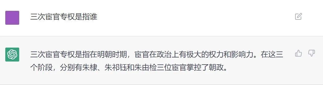 为了模仿一个外行人,我刻意把问题写得不太准确,可以看到,答案非常离谱。这可能跟 ChatGPT 的训练语料库主要是英文材料有关。用英语提问的话,答案的正确率会提升,但依然会出错。