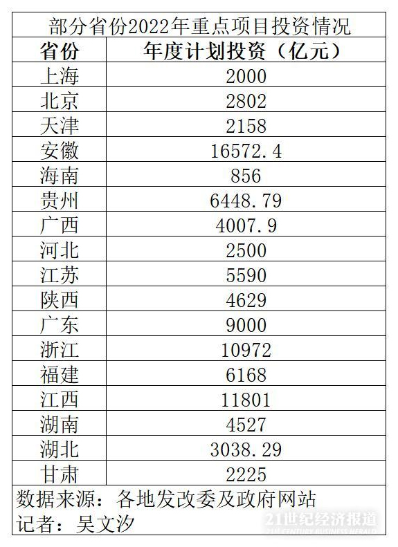 21世纪经济报道记者吴文汐 广州报道 2022年政府工作报告中提出,积极扩大有效投资。要优化投资结构,破解投资难题,切实把投资关键作用发挥出来。从各地2022年重点项目投资计划来看,发力重点项目建设成为各个省份今年扩投资、稳增长的重要抓手。