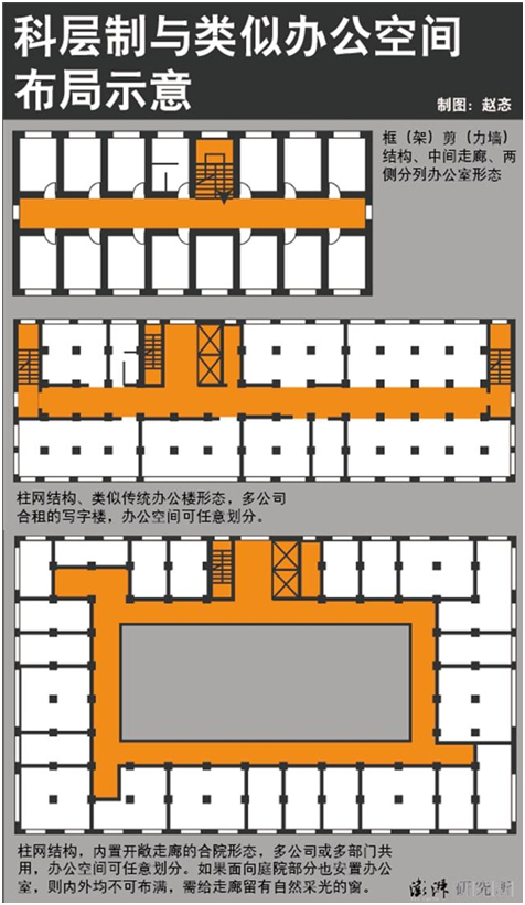从1950年代至今,现存的闲置办公建筑从布局而言主要分为两类。一类是传统的小办公室、中间或背面用走廊联通,每层置有公共厕所,在政府的办公楼中较为普遍。对于传统的办公楼而言,它的进深不会太大,改建成住宅的话也可以做到两边通风,不过户型朝向会出现一些问题。