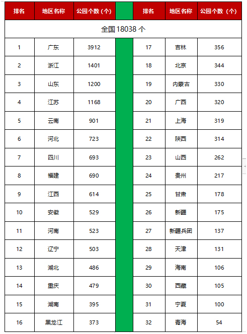 备注:全国城市公园发展不均衡,公园数量排名靠前的省份如广东、浙江、江苏、山东(全国唯四公园数量过千的省份)的情况也不容乐观,如果我们进一步计算人均公园数量情况,四个省份人均公园数量分别为2.94/人、8.39/人、6.91/人、4.8/人,结果依然可以用“惨不忍睹”来形容。