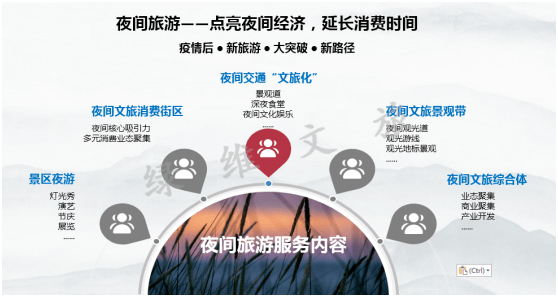 夜间旅游产品包括景区夜游、夜间文旅消费街区、夜间交通“文旅化”、夜间文旅景观带、夜间文旅综合体。基于景观灯光,基于夜间演艺,转化成多元化消费模式是重点。
