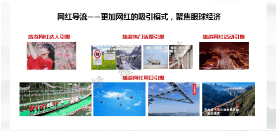 “全民网红”时代下,依托直播、电商、小视频等多渠道的流量变现,催热了网红经济和内容经济等创新模式!景区及文旅目的地也已经在逐步开展旅游网红景观、旅游网红项目、网红活动的导入和创新,作为提升二消的重要渠道。