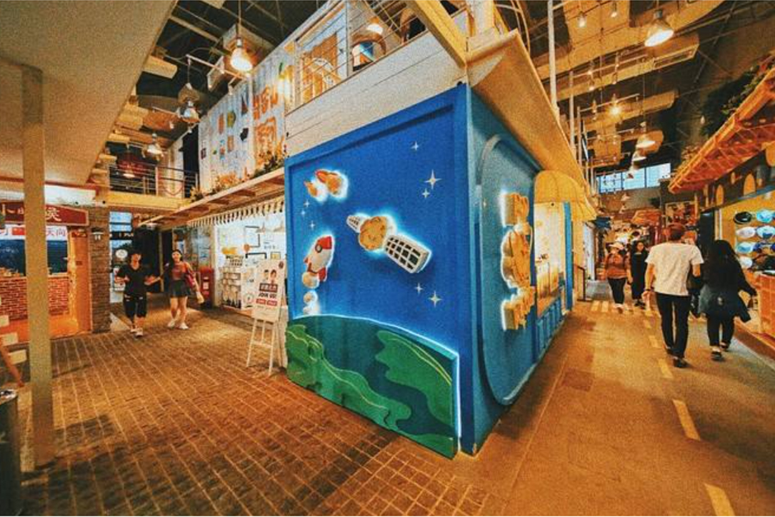 而“骑鹅公社”却锁定文艺青年,以奇幻、冒险、旅行和自我成长为主题,所以用集装箱做店铺。品牌也是整合了各地原创品牌,例如,原创手工艺品、台湾小吃、纸艺、音乐主题咖啡店。无论是内装风格店铺设计,还是品牌都吻合文艺青年们追求潮流创意,前沿个性的心理。