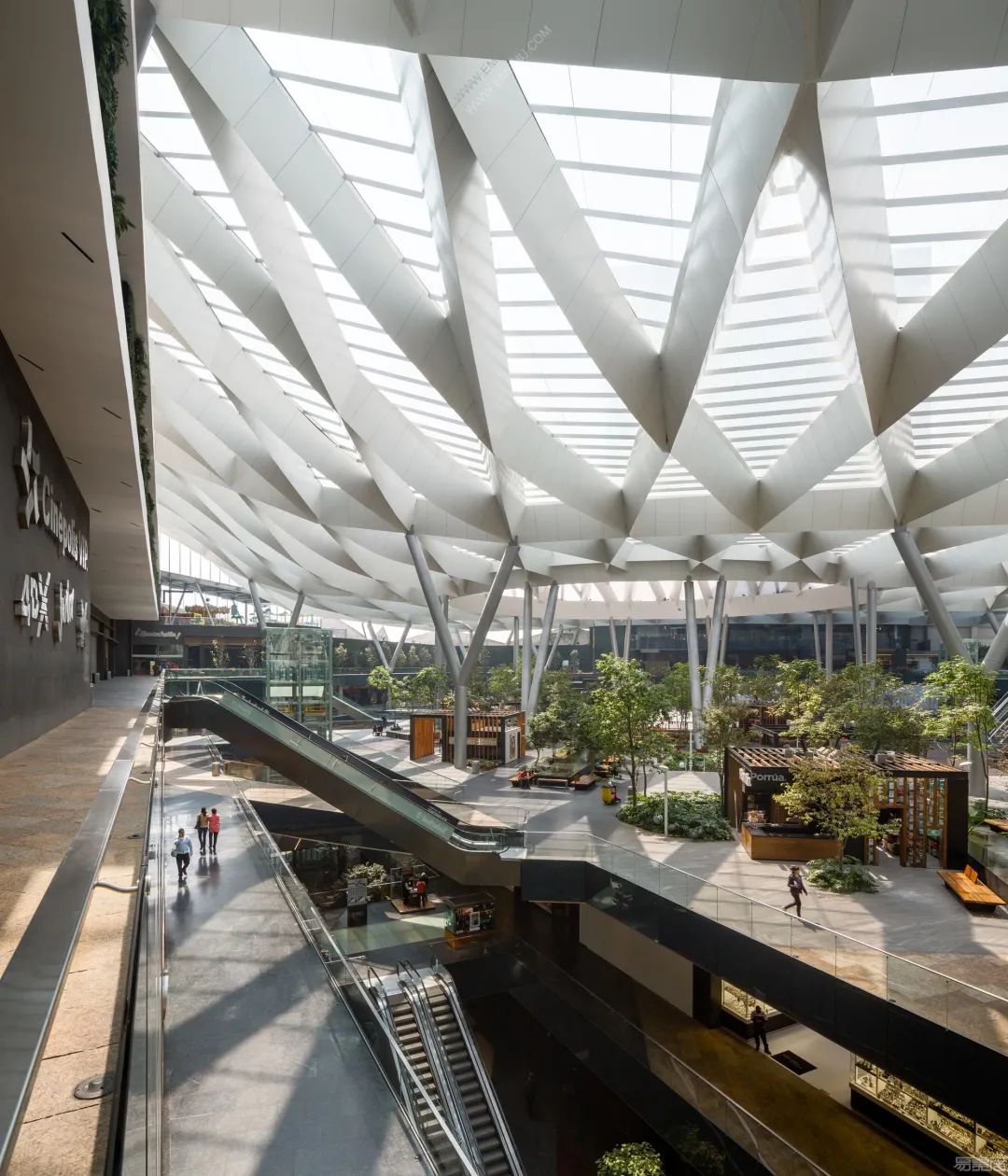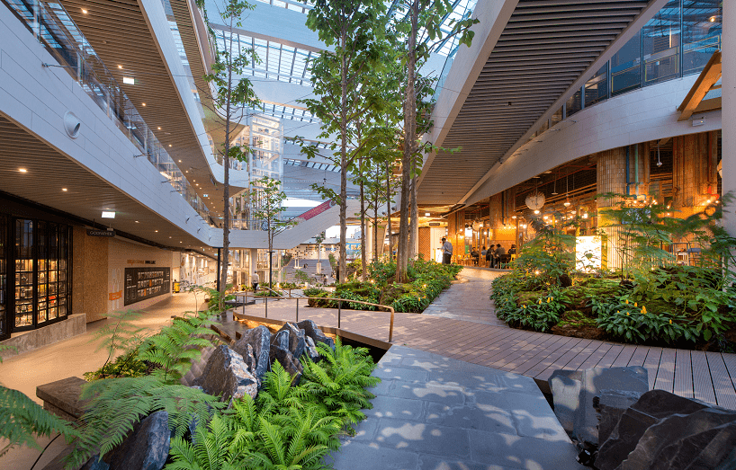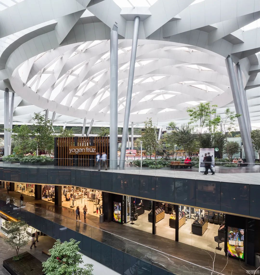 近几年,国内也出现了许多把绿色生态搬进商场的优秀代表,如香港置地打造的重庆光环购物公园。项目创造了一个由近300种热带雨林植物构成、垂直穿越整个商场的“沐光森林”植物园。商场顶部还设有7棵“悬浮树”和20米高的瀑布,非常壮观。走进植物园里,仿佛一脚踏进了亚马逊森林,能深刻感受到城市和自然的共生共存。