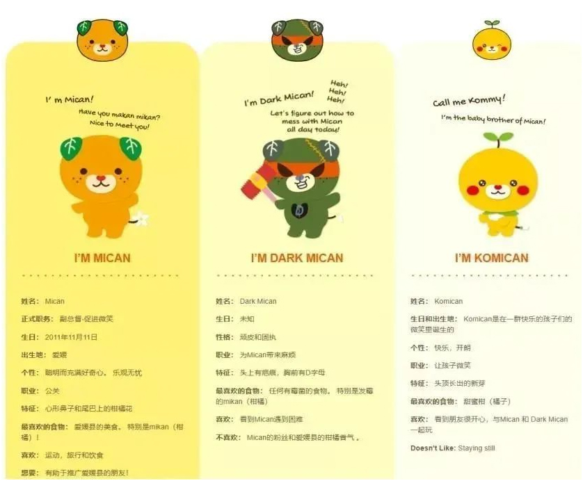 爱媛吉祥物MICAN家族的设计,融合了橘子与可爱的小狗等元素,在日本大受欢迎,曾在吉祥物大赏中荣获第三名;而MICAN的发音,也和日语中的“柑橘”一词相似。