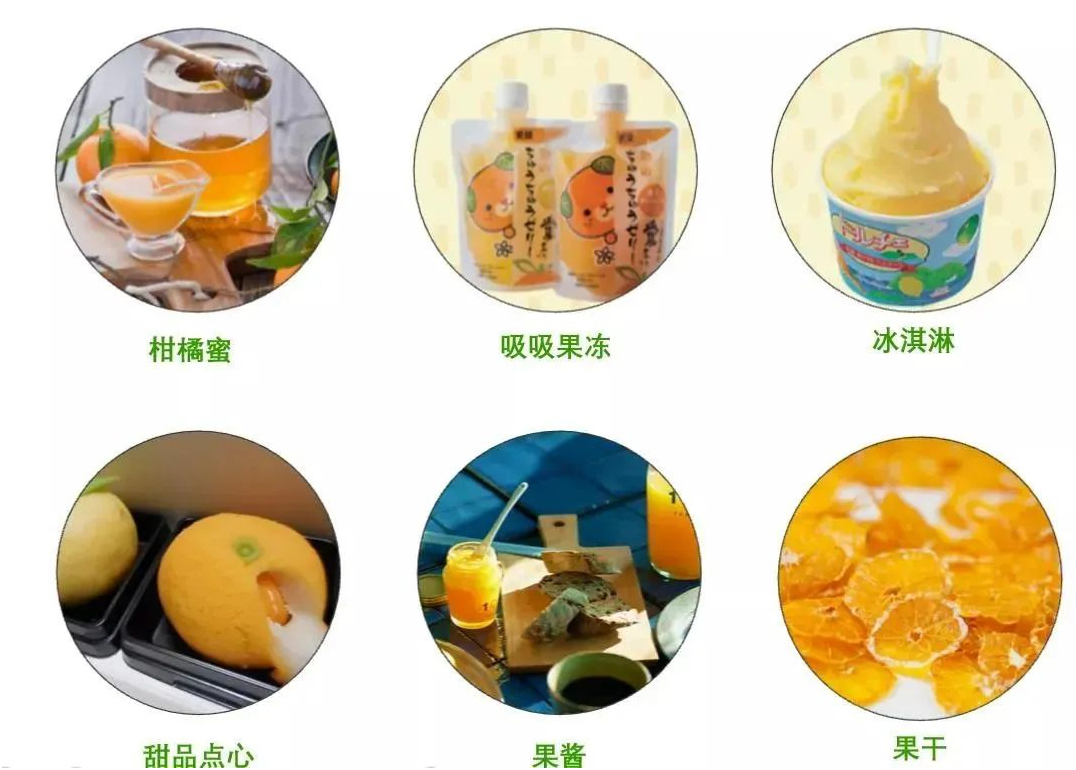 作为水果,除了直接食用以外,还能加工成各类果汁、果干等商品,以便保存、运输、销往各地。衍生产品的开发,极大地丰富了爱媛县的柑橘产业链。