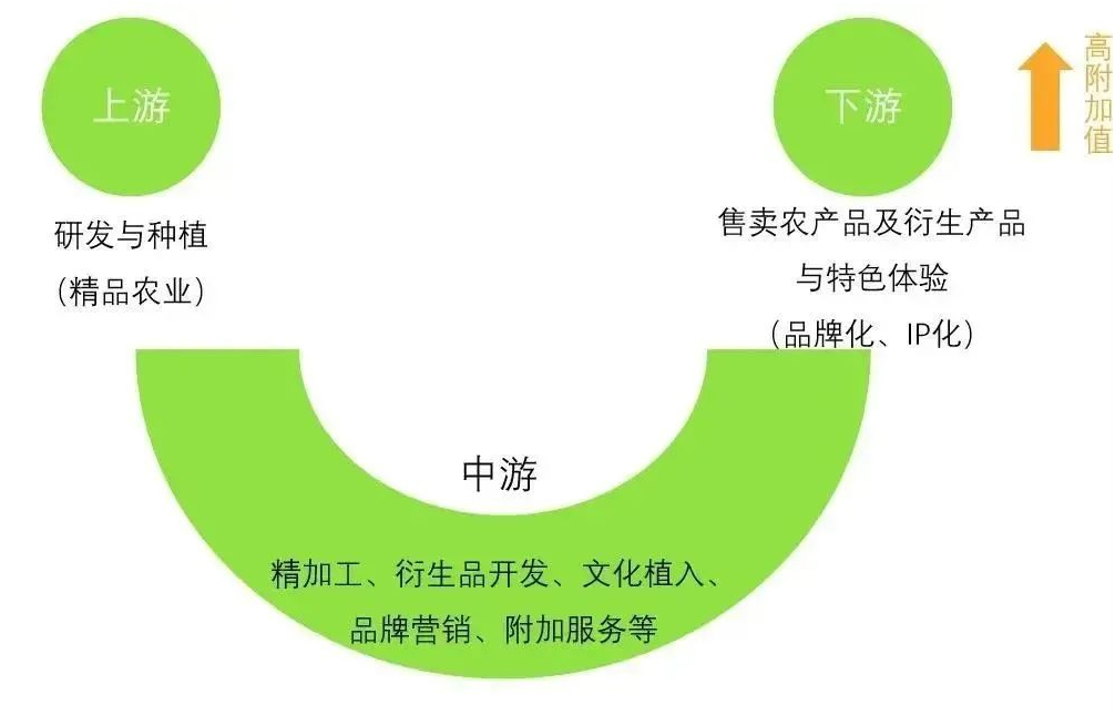 上游重研发,做精品农业。中游通过精加工、衍生品开发、文化植入、品牌营销、附加服务等手段。最终在下游售卖精致的农产品、衍生产品及其特色体验。