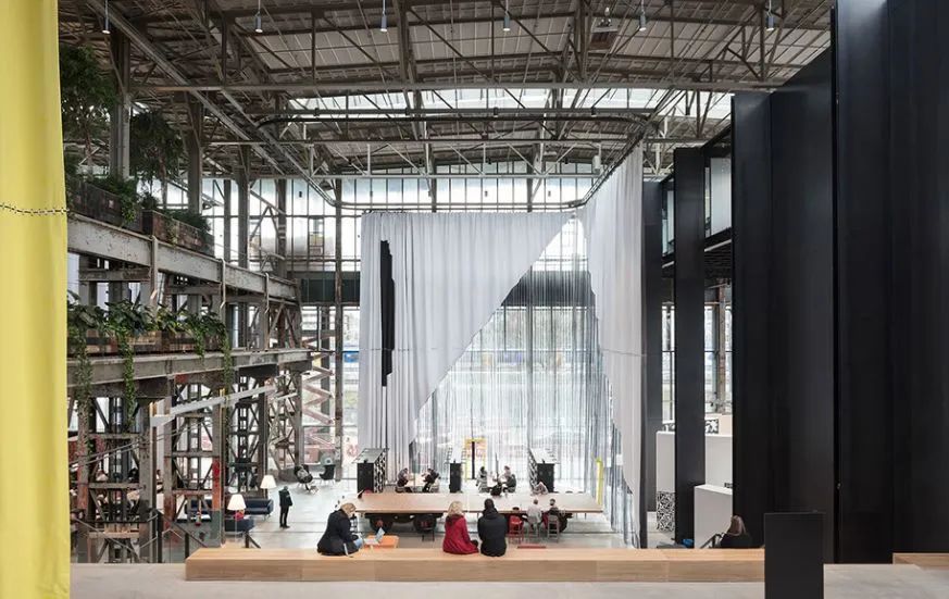 这里保留了工业建筑的大部分钢结构,包括高大的玻璃窗和高耸的铆钉柱。作为对原始建筑的现代重新诠释,由黑钢,混凝土,玻璃和橡木制成的新型实心结构与一系列可移动的巨型纺织纱窗相结合,可在建筑物内形成临时区域。