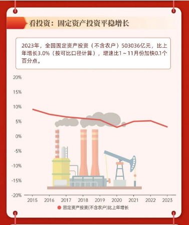8、2023年,全国固定资产投资(不含农户)50.30万亿元,比上年增长3.0%,扣除价格因素影响,增长6.4%;