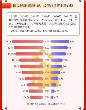 1、2023年全年国内生产总值1260582亿元,按照可比价计算,经济增量超过6万亿元,相当于一个中等国家一年的经济总量;