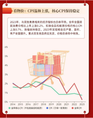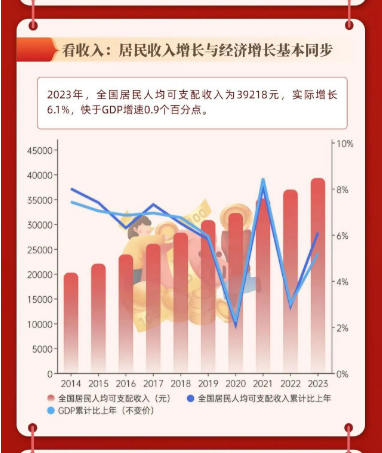 4、在居民收入和消费支出方面,2023年全国居民人均可支配收入为39218元,实际增长6.1%,快于5.2%的GDP增速;