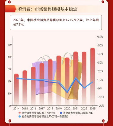 从社会零售来看,2023年社会消费品零售总额突破47万亿元,比上年增长7.2%。