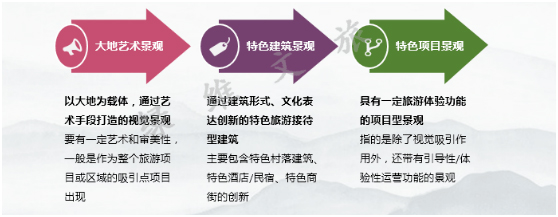 标志性旅游景观与旅游区、景区的“主题”正相关,能成为项目的吸引力和独特性卖点,可概括为大地艺术景观、特色建筑景观、特色项目景观。