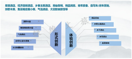 从民宿到精品酒店到主题酒店,从亲子酒店到度假酒店,目前星级变得不那么重要了,重要的在于其特色,主要涉及形式创新和体验创新这两个方面,郊野木屋、集装箱小屋、气泡酒店、房车营地,太空胶囊、悬崖酒店等,都是形式的变化,而体验的创新是不一样的,体验重在文化体现、游乐内容、养生内容、科技运用等。