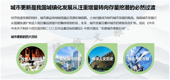 城市更新是国家城镇化水平进入一定发展阶段之后面临的主要任务。我国经历了改革开放40年以来的粗放式快速增长,城市空间结构从增量扩张转向存量提质已是必然。城市更新也成为绿维文旅近几年关注的重点,参与了大量城市更新项目。